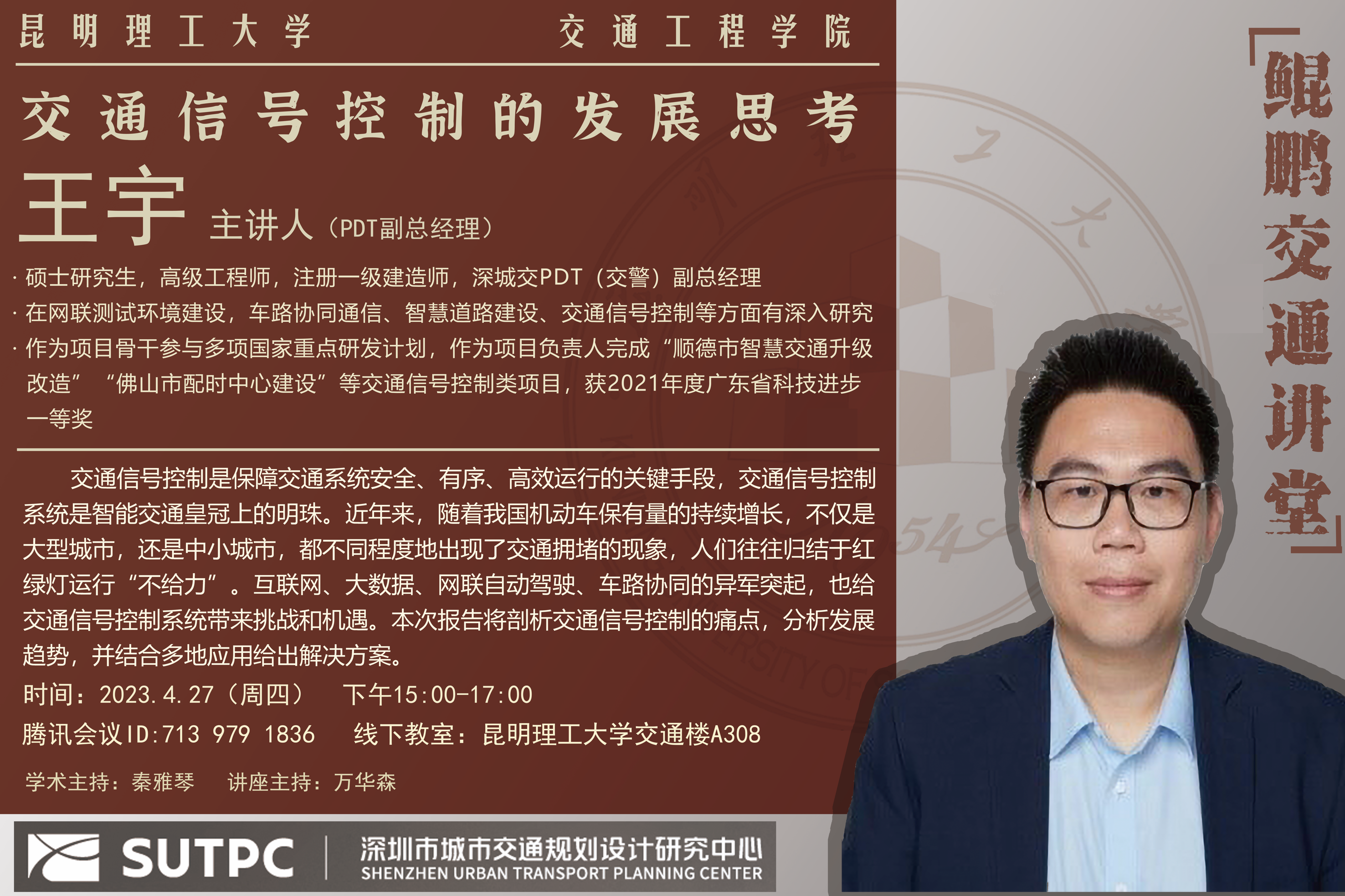 与深圳市城市交通规划设计研究中心(深城交)联合举办的“鲲鹏交通讲堂”,在交通楼A308开启了2023年的第二讲。深城交PDT(产品开发团队)交警业务线王宇副总经理带来了题为“交通信号控制的发展思考”的精彩报告,交通星力