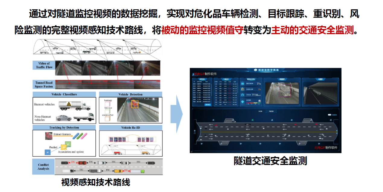 讲座中,贾磊博士展示了集监测视频采集和处理、交通参数检测、交通事件分析、交通信息管理功能于一体的隧道综合管理平台。针对隧道环境中危化品车辆监控存在缺乏车型分类标准、跨摄像机跟踪难度大、车辆动态风险检测难等挑战,基于视频目标检测、目标跟踪与随机森林决策树等方法,提出了基于轻量化骨干网络的危化品车辆车型检测方法,融合隧道时空信息的危化品车辆重识别技术、基于监控视频的隧道交通冲突预测方法,并开发了基于视频的隧道车辆安全监测系统。