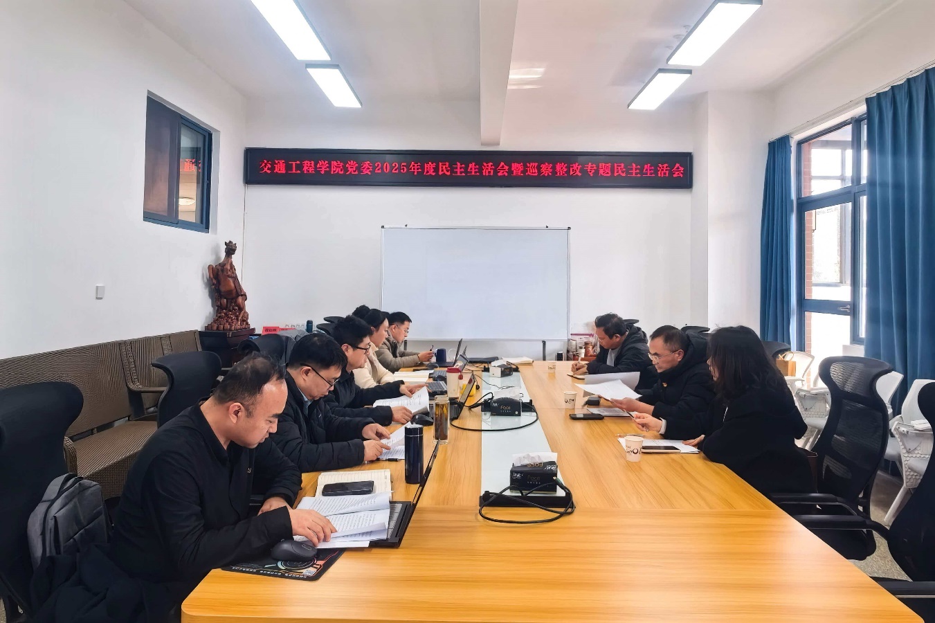 按照学校党委的统一部署和要求,学院党委于1月15日下午在交通楼A517会议室召开2025年度处级党员领导干部民主生活会暨巡察整改专题民主生活会。校党委领导班子民主生活会第七督导组组长赵宾同志和3名组员到会指导,会议由学院党委书记张强同志主持。