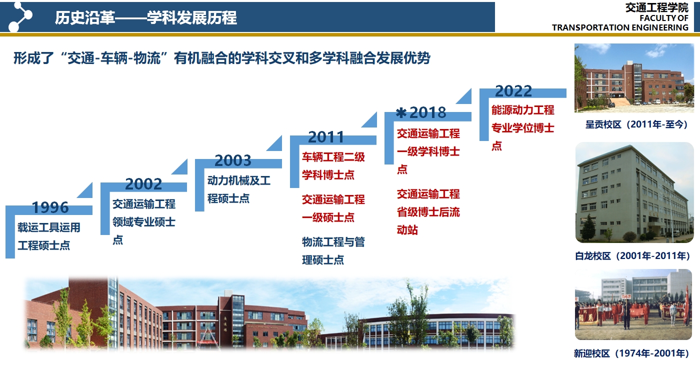 研究生教育: 2002年交通运输工程获批工程硕士学位授权点 2003年设动力机械及工程硕士学位授权点 2011年车辆工程获批二级学科博士学位授权 2011年交通运输工程获批一级学科硕士学位授权点 2012年设物流工程与管理硕士学位授权点 2018年交通运输工程一级学科博士学位授权点 2018年交通运输工程省级博士后流动站 NEW!2020年能源动力工程专业学位博士点