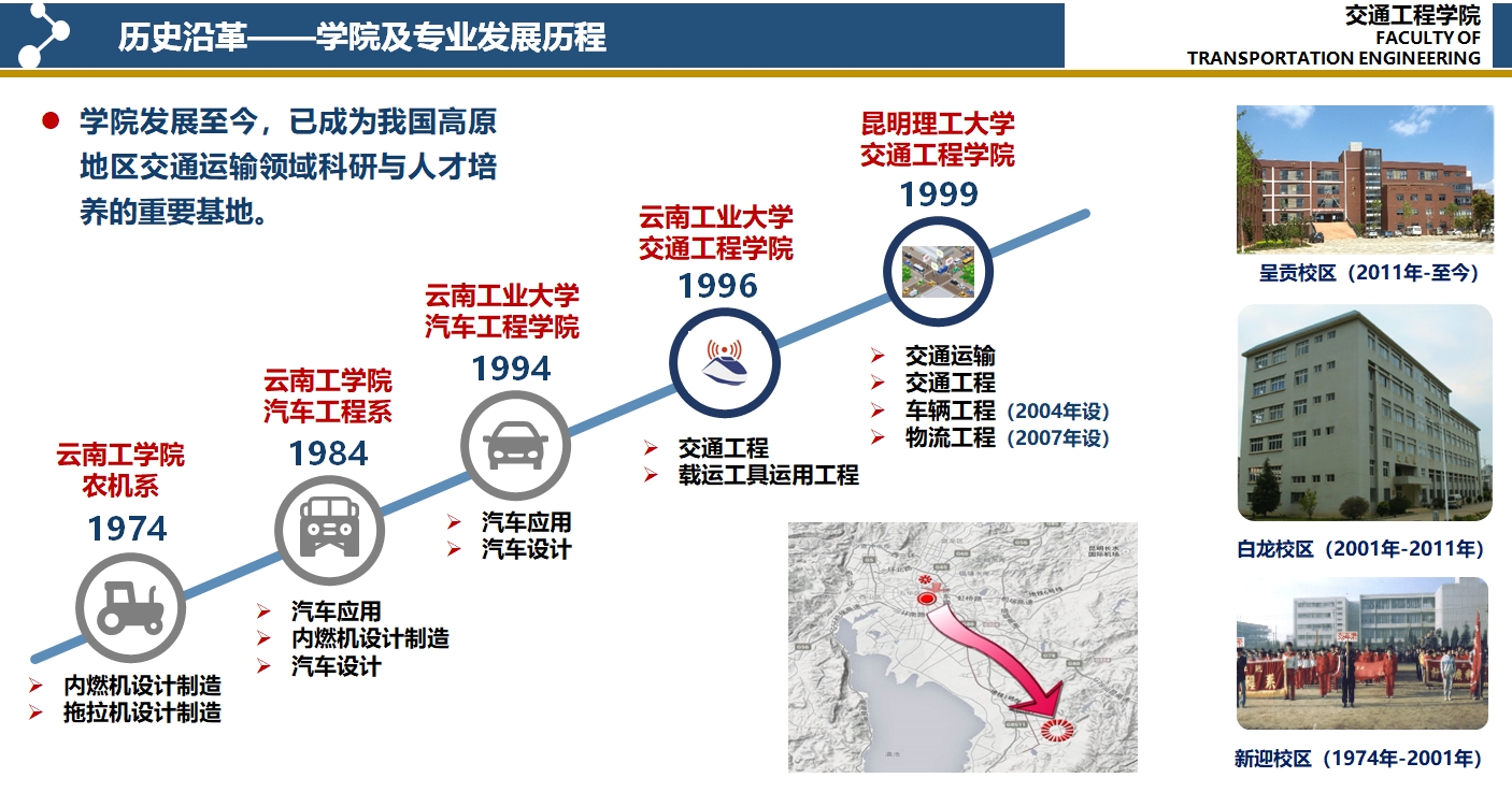 现有交通工程、交通运输、物流工程、车辆工程四个本科专业和物流工程(中外合作办学)专业。交通工程专业于2017年通过工程教育专业认证,2019年获批国家级一流本科专业建设;车辆工程专业于2018年通过工程教育专业认证,是教育部首批新工科实践与探索项目专业,2019年获批省级一流本科专业建设;物流工程专业是云南省重点产业引领品牌专业、教育部批准的中外合作办学项目;交通运输专业是云南省本科综合改革试点专业。