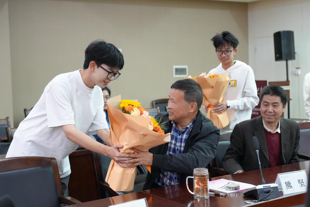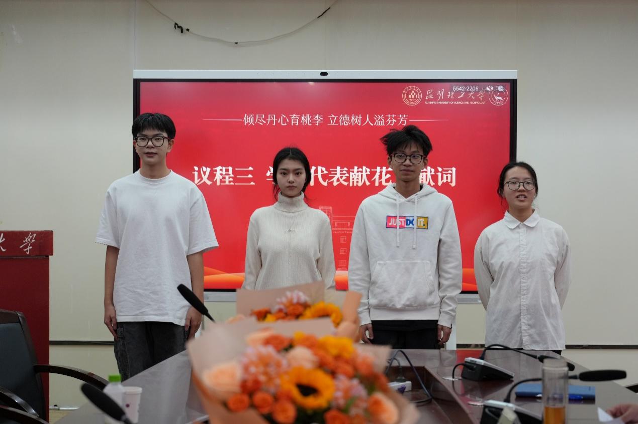 学生代表手捧鲜花,上台向四位老师致敬,并代表全体学生发表感言。他们表示,感谢老师们的悉心指导和谆谆教诲,让他们不仅掌握了专业知识,更收获了追求卓越的信念和迎接挑战的勇气。作为交通学子,他们将铭记恩师的期望与教诲,继续努力学习、奋勇拼搏,积极投身交通强国建设,用更好的成绩回报师恩。