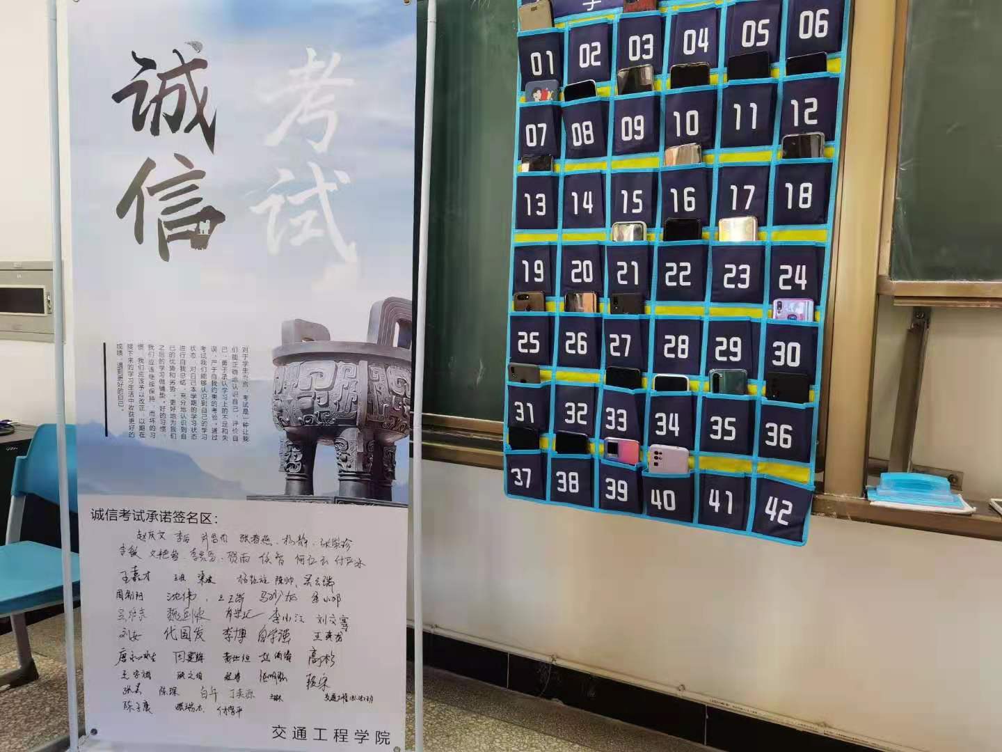 在无人监考考场中,讲台一侧立有带所有考生签名的《诚信考试承诺书》,同时讲台上还设有手机袋方便同学们考试前放置手机。考试过程井然有序,同学们按照《星力