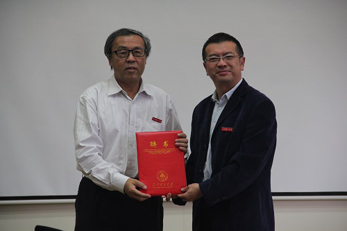首先,交通院副院长戢晓峰介绍了杨东援教授的相关情况,然后,牛治亮副校长向杨东援教授颁发了名誉院长聘书并佩戴校徽。