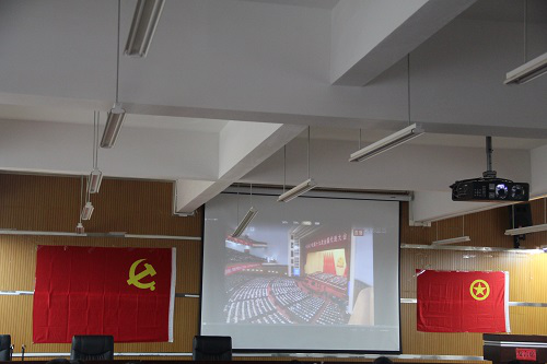 同学们有序入场坐下后并开始认真观看党的十九大盛况,与此同时,组织部部长给在场每一位同学发放团徽进行佩戴。观看过程中,我们了解到中国共产党第十九次全国代表大会于2017年10月18日在北京召开。这是我们党在全面建成小康社会决胜阶段,中国特色社会主义发展关键时 2017年10月18日12:30,星力