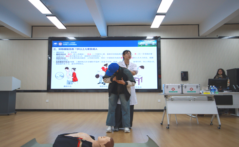 第一阶段,邀请我校医学部研究生张颖担任急救技能培训主讲,针对异物梗阻处理、心肺复苏、创伤包扎、溺水急救、毒气中毒等应急救治措施进行讲解并指导现场同学进行实操练习,让大家全方位、更直观地感受和掌握急救要领。